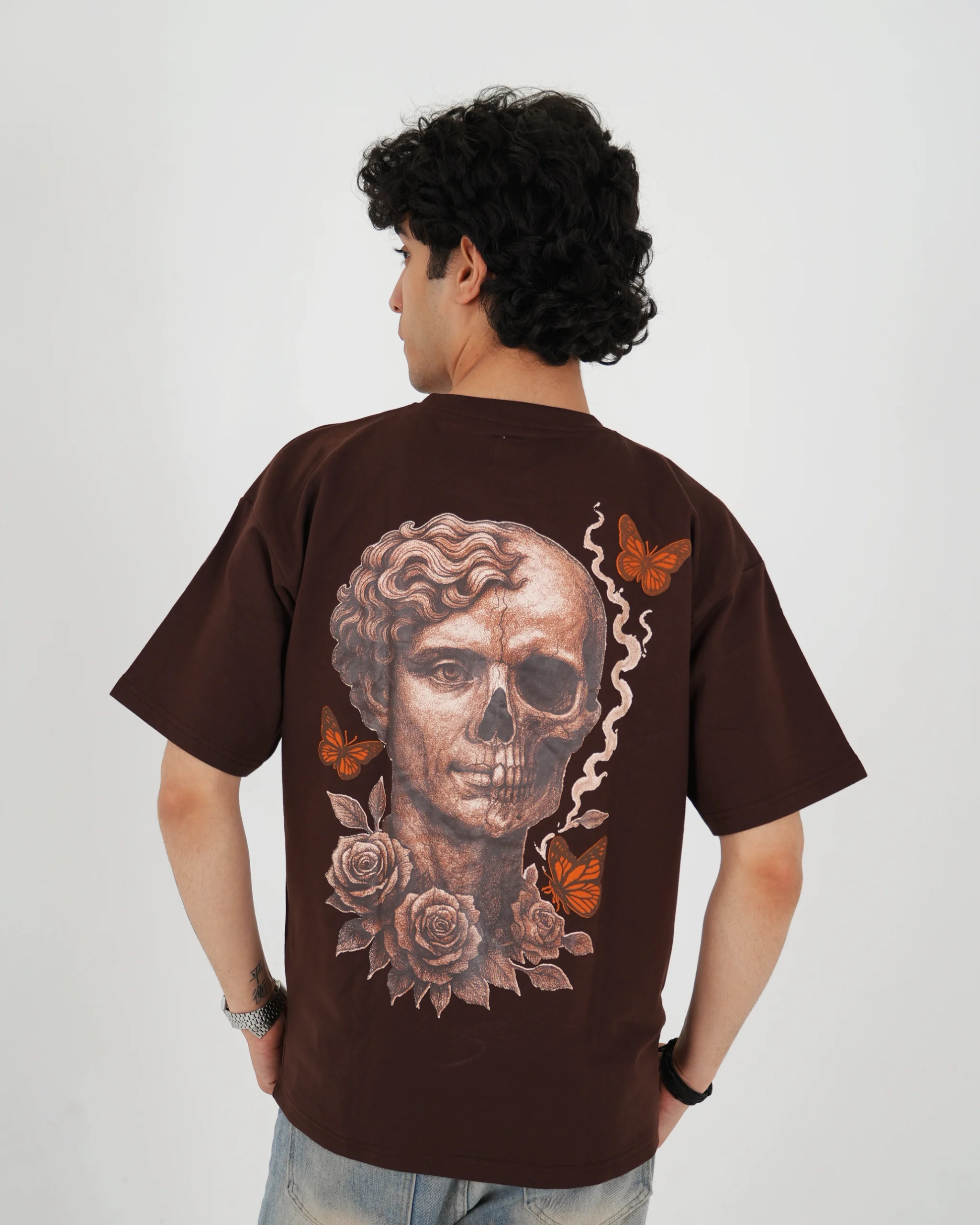 Life, death, and everything in between- Fleeting Flesh captures the duality of beauty and decay. The half-skull face, framed by roses and butterflies, reflects transformation and the fleeting nature of time. A bold, thought-provoking back print on premium oversized t-shirt with detailed puff on the butterflies for those who wear meaning.