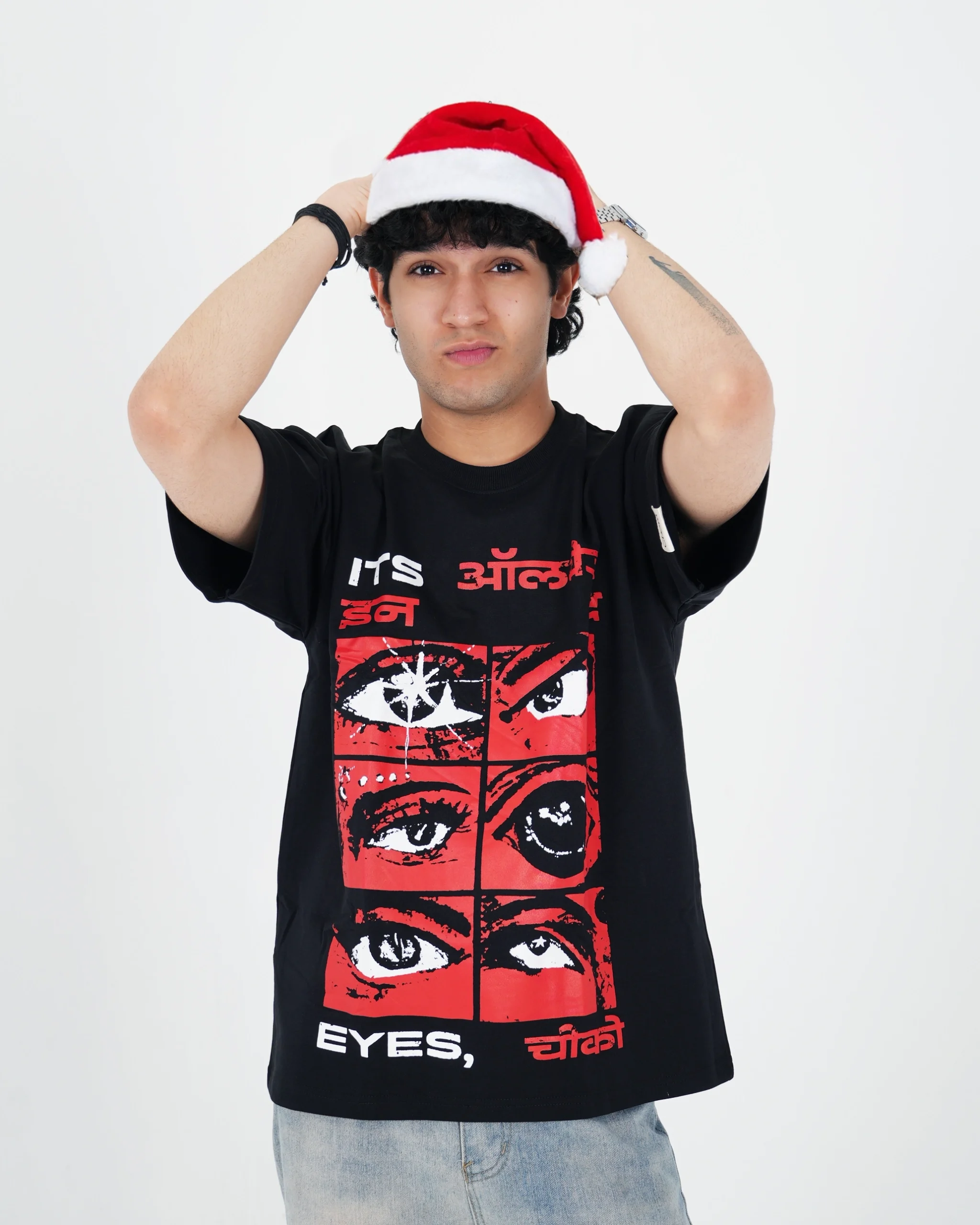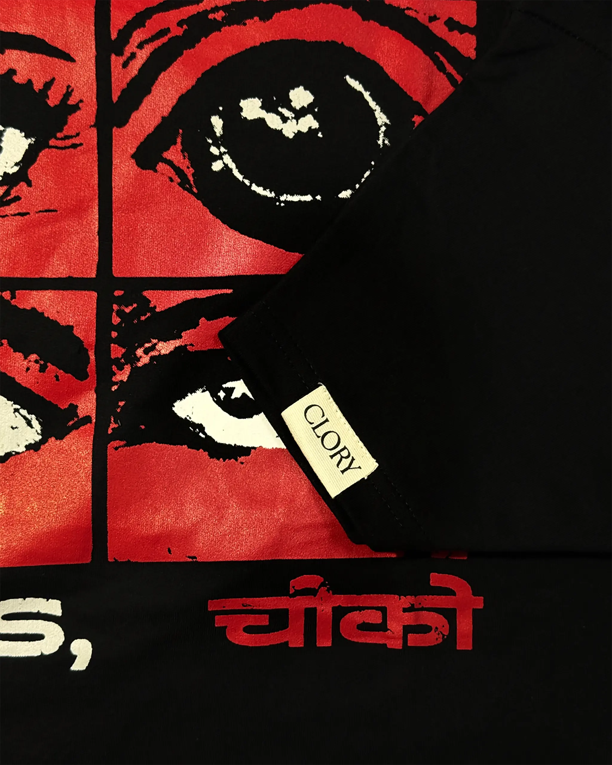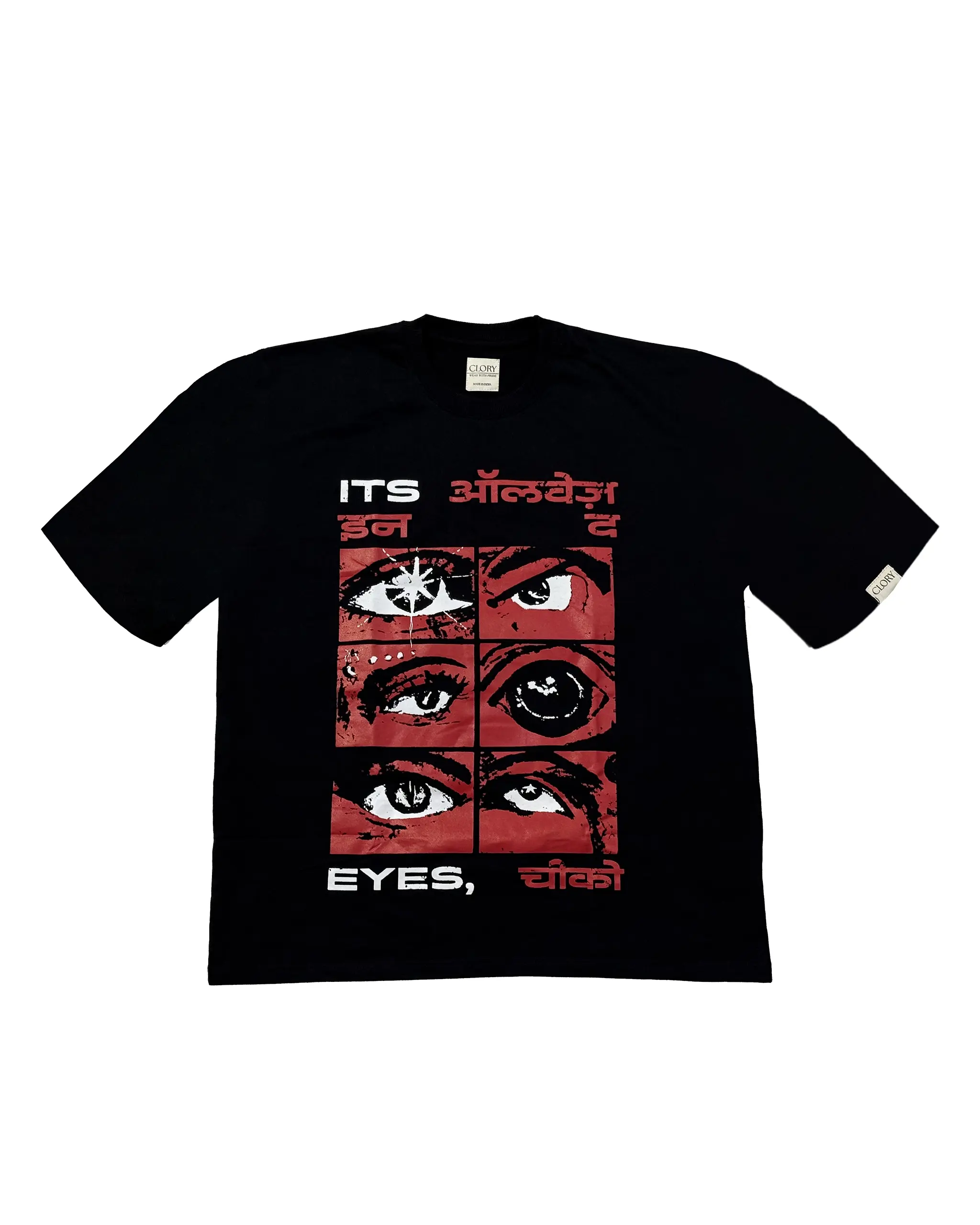 This bold premium black t-shirt captures raw emotion through six intense eyes, telling stories of love, rage, and rebellion. Fusing streetwear with Devanagari and English typography, the design reflects a striking cultural crossover. With its heavy cotton feel and red-black aesthetic, this graphic tee is made to stand out. Because sometimes, the loudest things are never said – just seen.