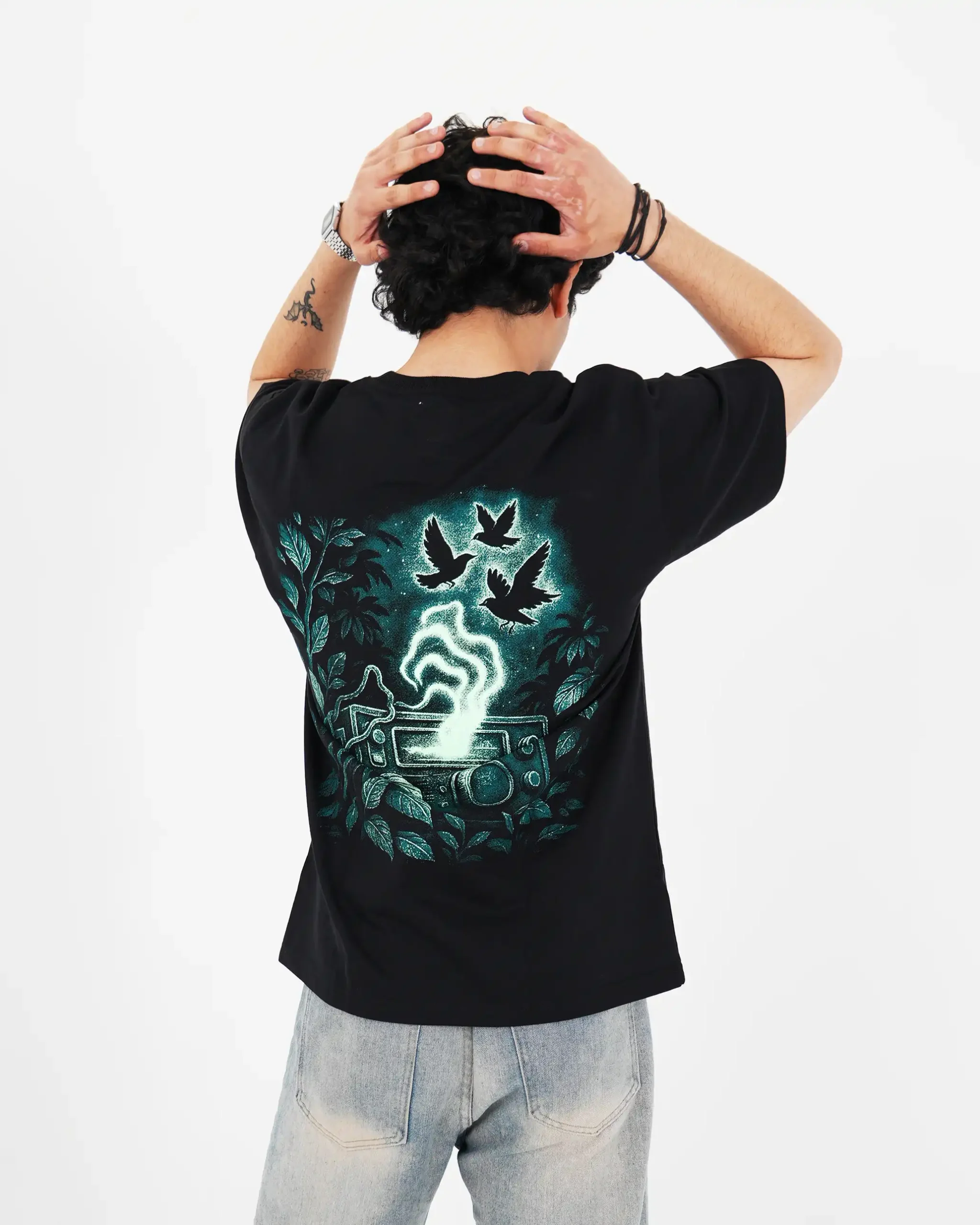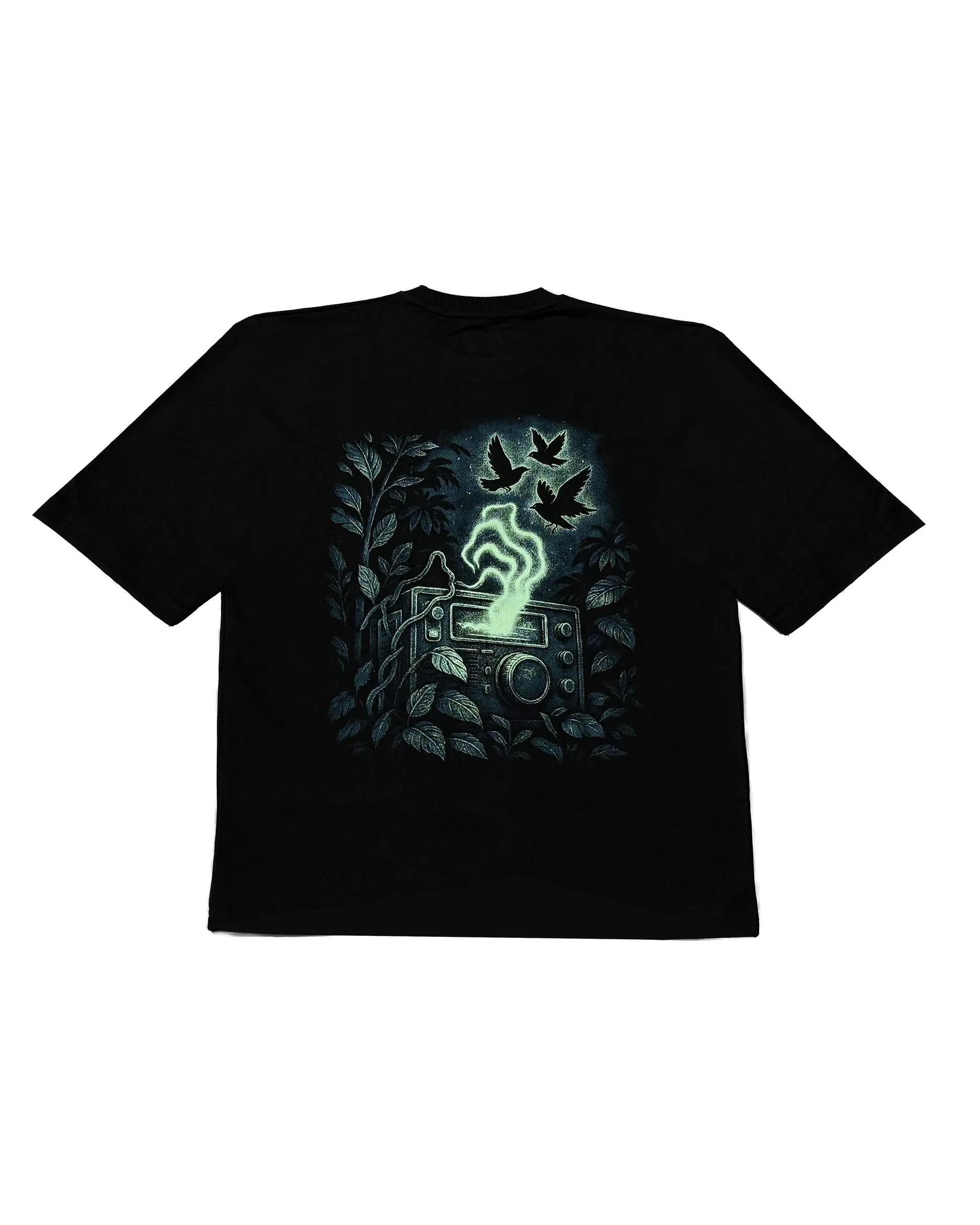 Step into the static of the unknown. Midnight Jungle Radio features a retro radio lost in the jungle, broadcasting surreal waves into the night sky. Surrounded by glowing birds and thick foliage, this screen-printed design on premium quality oversized t-shirt lights up with mysterious energy , perfect for night owls, dreamers, and those who vibe with the strange frequency of the wild.