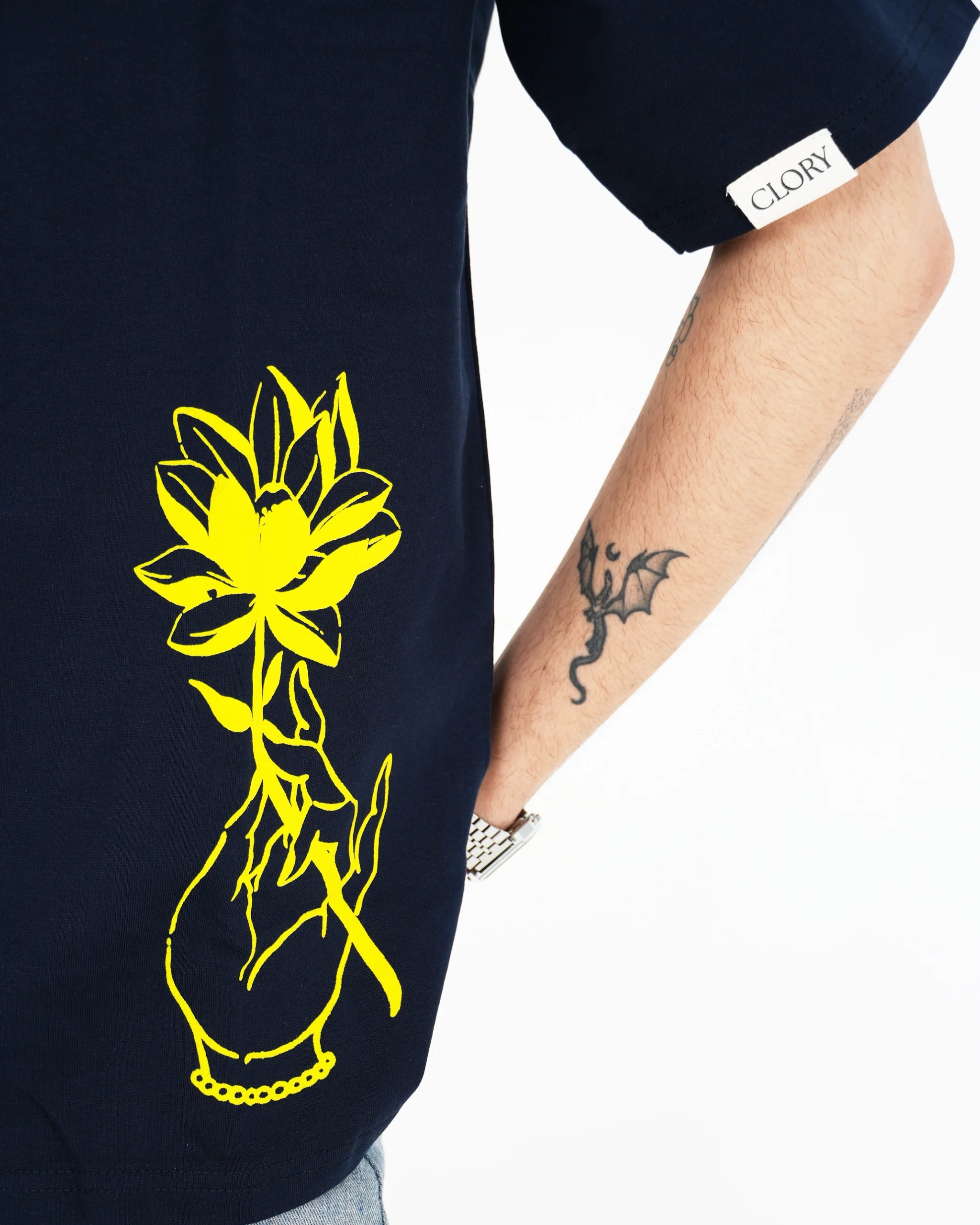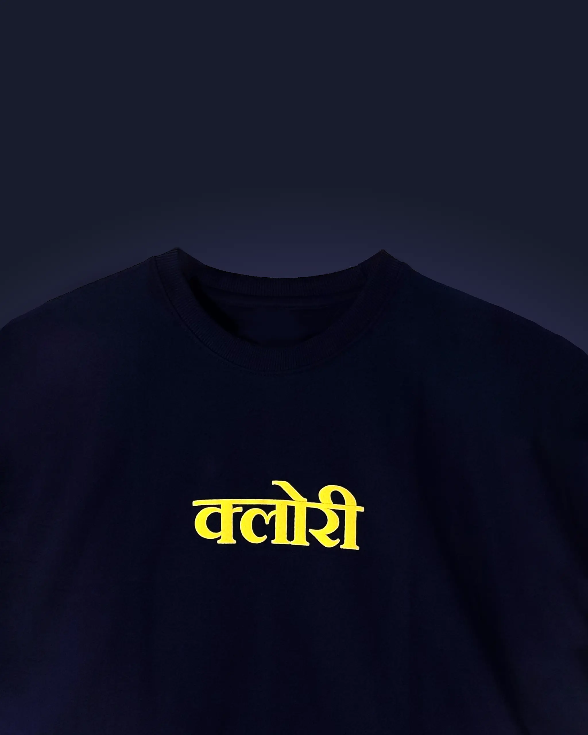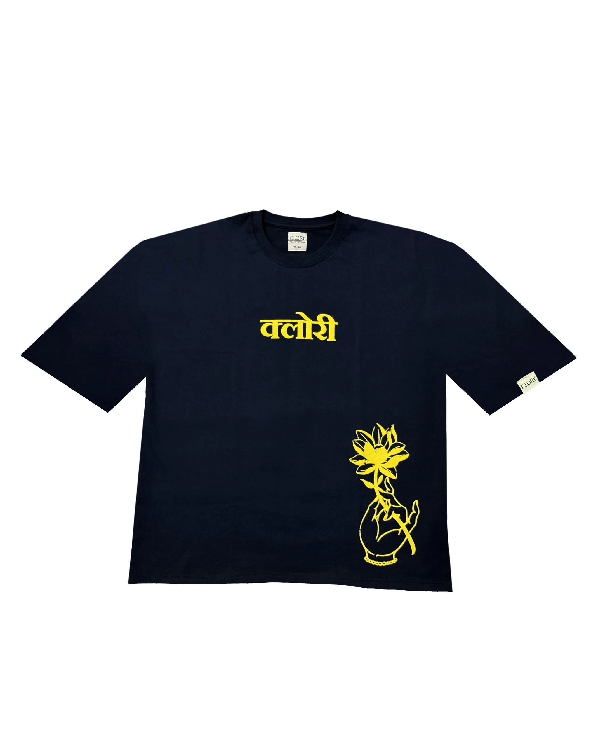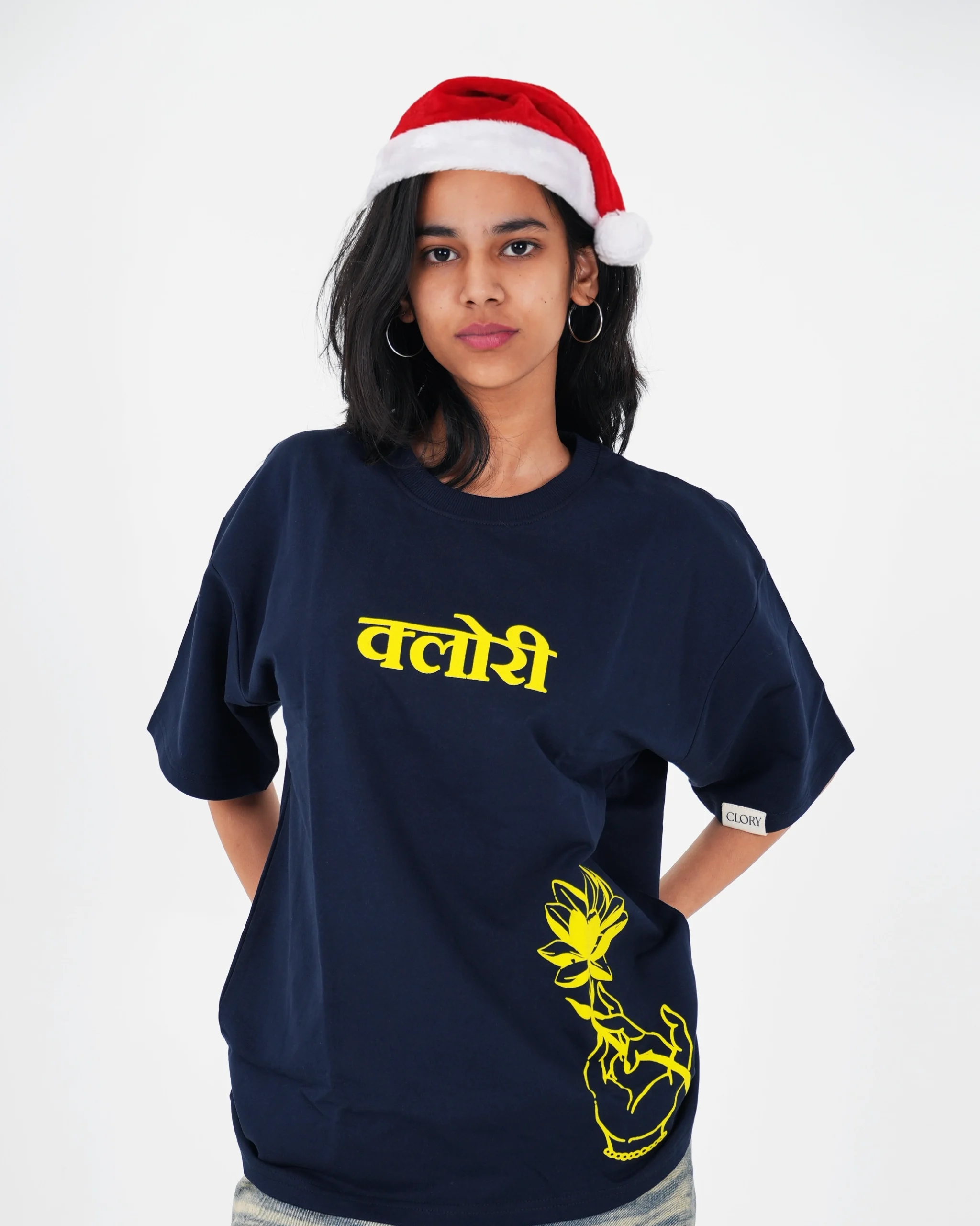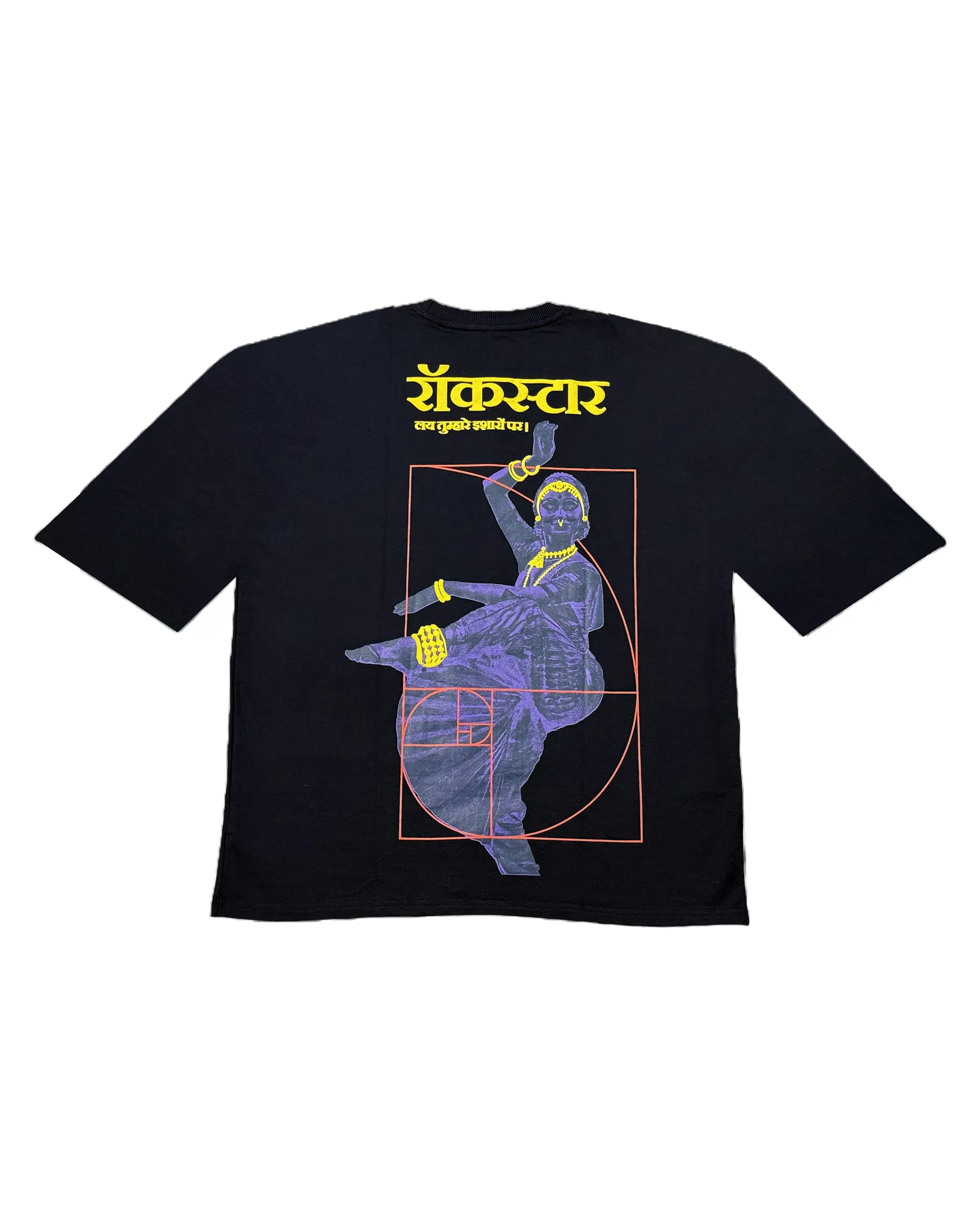 This navy blue oversized t-shirt blends Indian streetwear aesthetics with heritage art, featuring a classical dancer framed in the golden ratio. The puff print Devanagari text “Rockstar” and “Clory” stand out boldly against the intricate screen print artwork. Made from 260 GSM premium cotton, it delivers comfort and a statement in one. A perfect piece of artistic streetwear that celebrates culture, rhythm, and rebellion through design.